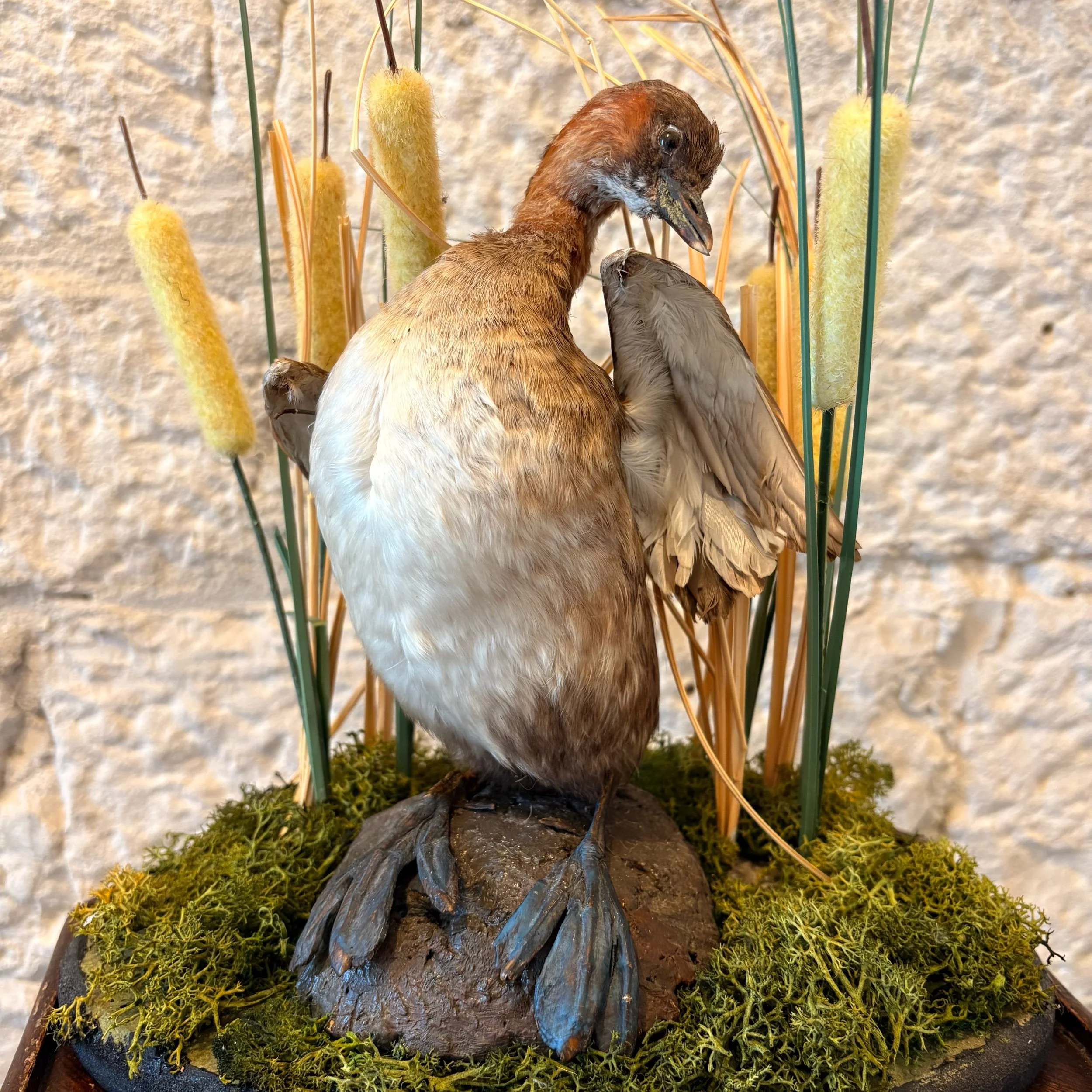 A lovely Taxidermy “Little Grebe” depicting the bird amongst the Reeds on a small rock.